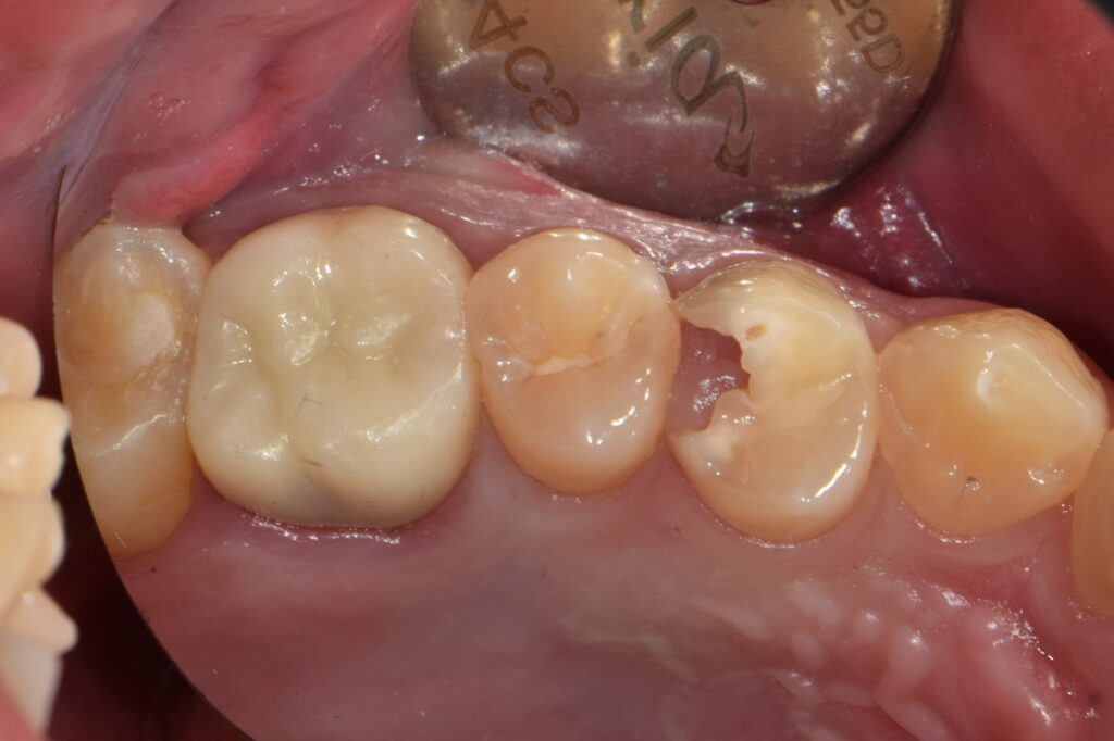 처음 오셨을 때의 모습입니다. 충치가 심하게 진행되어 치아 머리 부분의 대부분이 사라졌고, 그 빈 공간을 부어오른 잇몸 살이 가득 채우고 있었습니다.