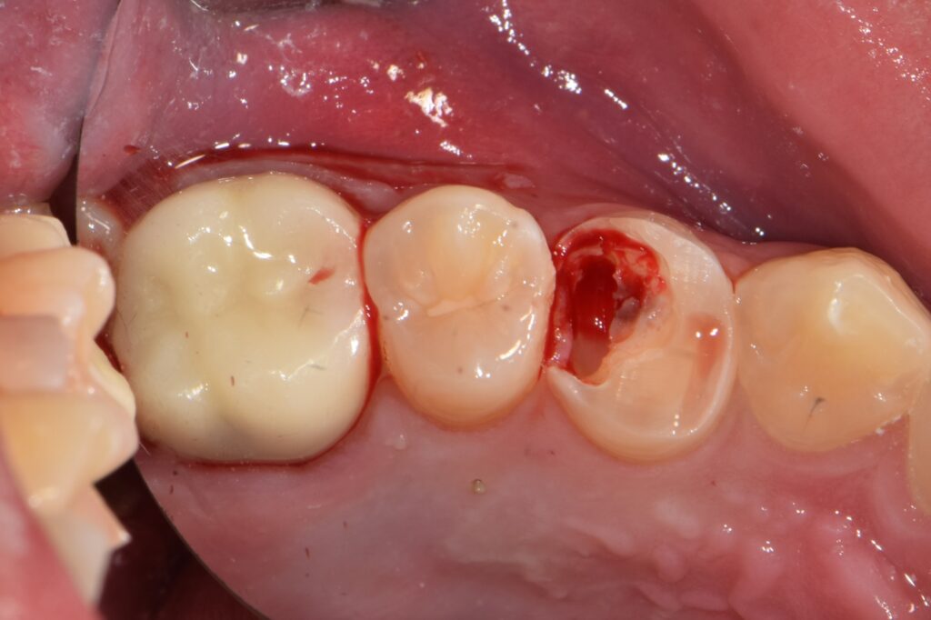 충치가 심해 치아가 깨진 채로 방치하다 보면, 어느 순간 “치아 구멍 안으로 잇몸 살이 차오르는” 무서운 경험을 하게 됩니다. 치과 용어로는 잇몸이 증식되었다고 하는데, 이렇게 되면 치료 기구가 닿을 때마다 피가 나고 시야가 확보되지 않아 치료 난이도가 급격히 올라갑니다.