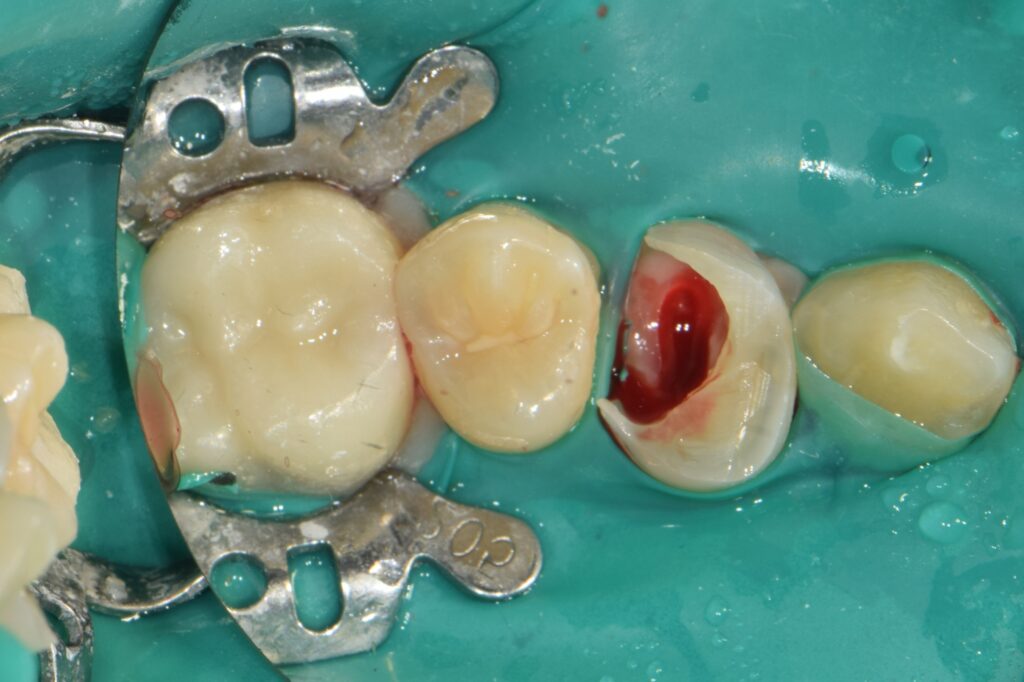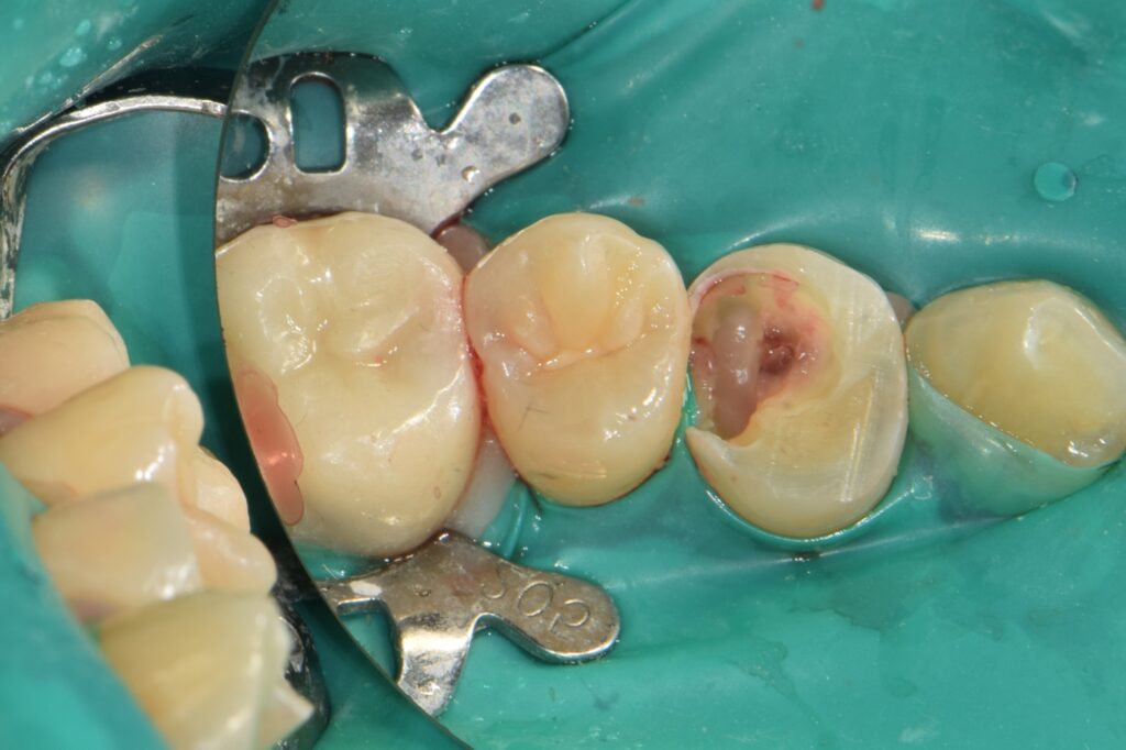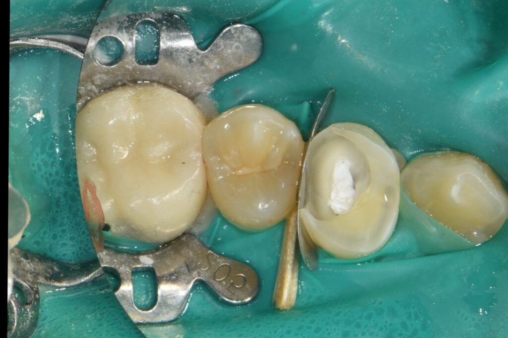 그래서 러버댐을 걸고, 무너진 치아 주변에 **단단한 레진으로 가짜 벽(Wall)**을 만들어줍니다.