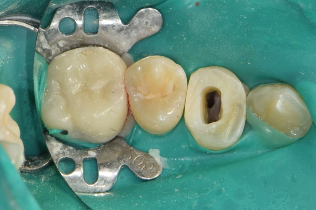 이 과정이 오늘 치료의 하이라이트입니다. 신경치료(근관치료)를 하려면 소독약이 새지 않고 침이 들어가지 않도록 ‘밀폐’가 되어야 하는데, 치아 벽이 다 무너져서 불가능한 상황이었죠.